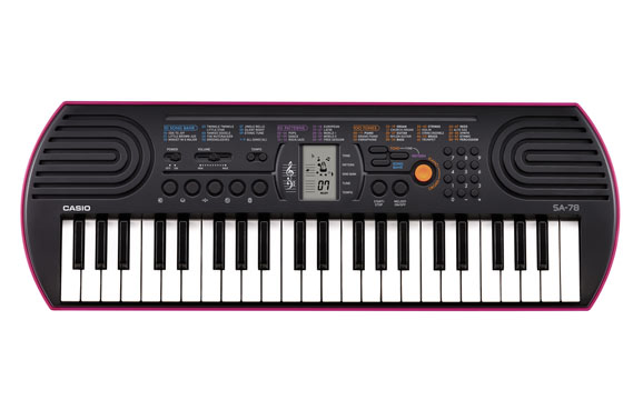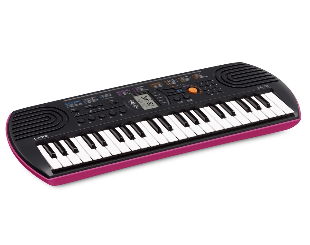 SA-76 und SA-78 bieten allen musikalischen Entdeckern mit 44 Tasten bereits den nötigen Umfang für das Spielen erster Melodien. 100 Klangfarben, 50 Rhythmen und 10 integrierte Songs stehen für echte Abwechslung - die LSI-Klangerzeugung und die 8-stimmige Polyphonie für gute Klangqualität. Das LC-Display hilft beim Auswählen und Abrufen der vielen musikalischen Möglichkeiten. Dazu gibt es einen auffälligen Umschaltknopf für den einfachen Wechsel zwischen Piano- und Orgel-Modus. Ansonsten unterschieden sich beide Minikeyboards durch ihre Farbgebung: Beim SA-76 ist das untere Gehäuse rot-orange, beim SA-78 ist es pink. Ob fröhlich in rot-orange oder frech in pink - beide SA-Modelle mischen kreativ das Kinderzimmer auf. •100 Klangfarben •50 Rhythmen •Piano/Organ-Setting Taster •10 Übungsstücke •LC-Display •5 Drumpads •Übungssystem Melody Cut