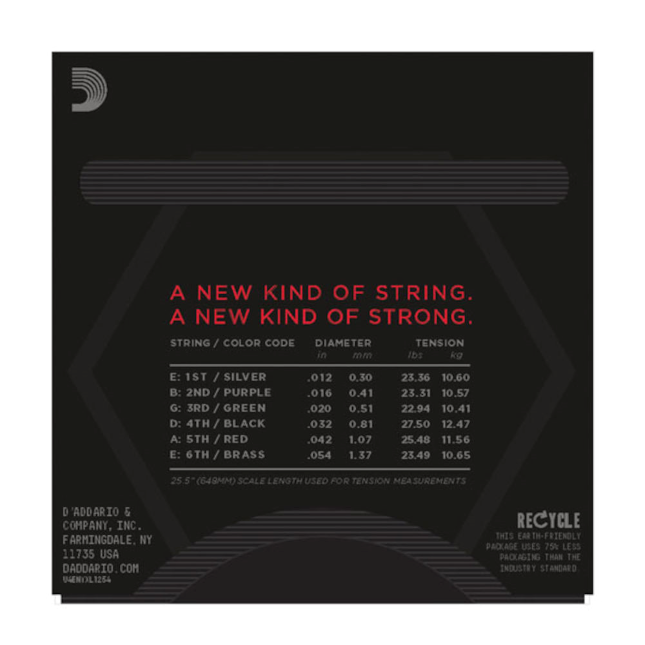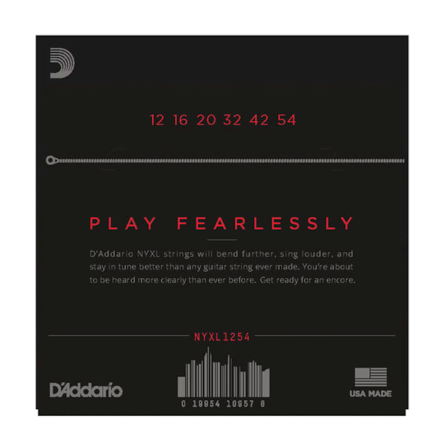 - Der NYXL1254 Saitensatz besitzt eine G-Saite aus reinem Stahl und liefert somit mehr Flexibilität als handelsübliche Saitensätze in dieser Stärke. Diskantsaiten: .012, .016, .20, Basssaiten (unwickelt): . 032, .042, .054