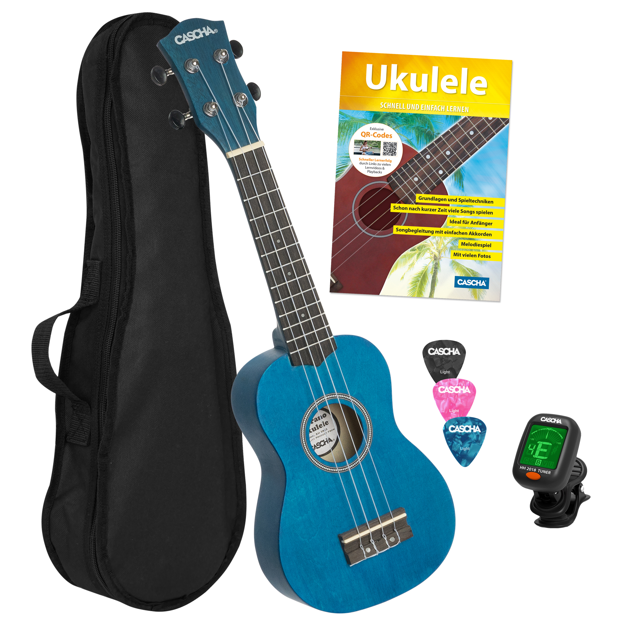 Cascha Sopren Ukulelen-Bundle -  blau - inkl. Gigbag, Stimmgerät, 3 Plektren & Ukulelenschule