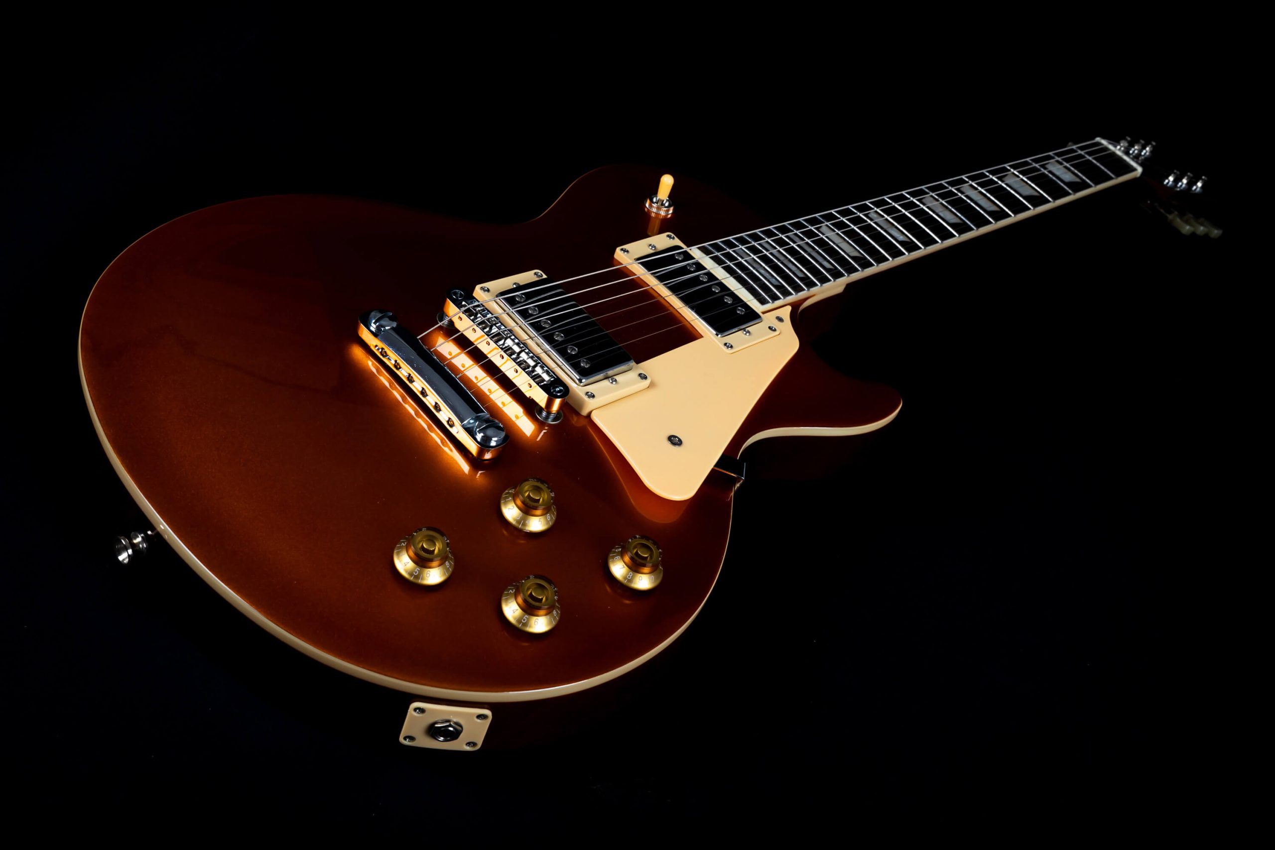 Absolut top verarbeitete und super spielbare JET LP-Gitarre in der Farbe Goldtop. Der Korpus und Hals sind aus Mahagoni, das Griffbrett aus Palisander! Hervorragende Bespielbarkeit und super Sound durch die 2 Alnico Pickups aus Korea. Die Farbe Gold mit einem leichten Touch Copper (Messing) ist absolut edel.