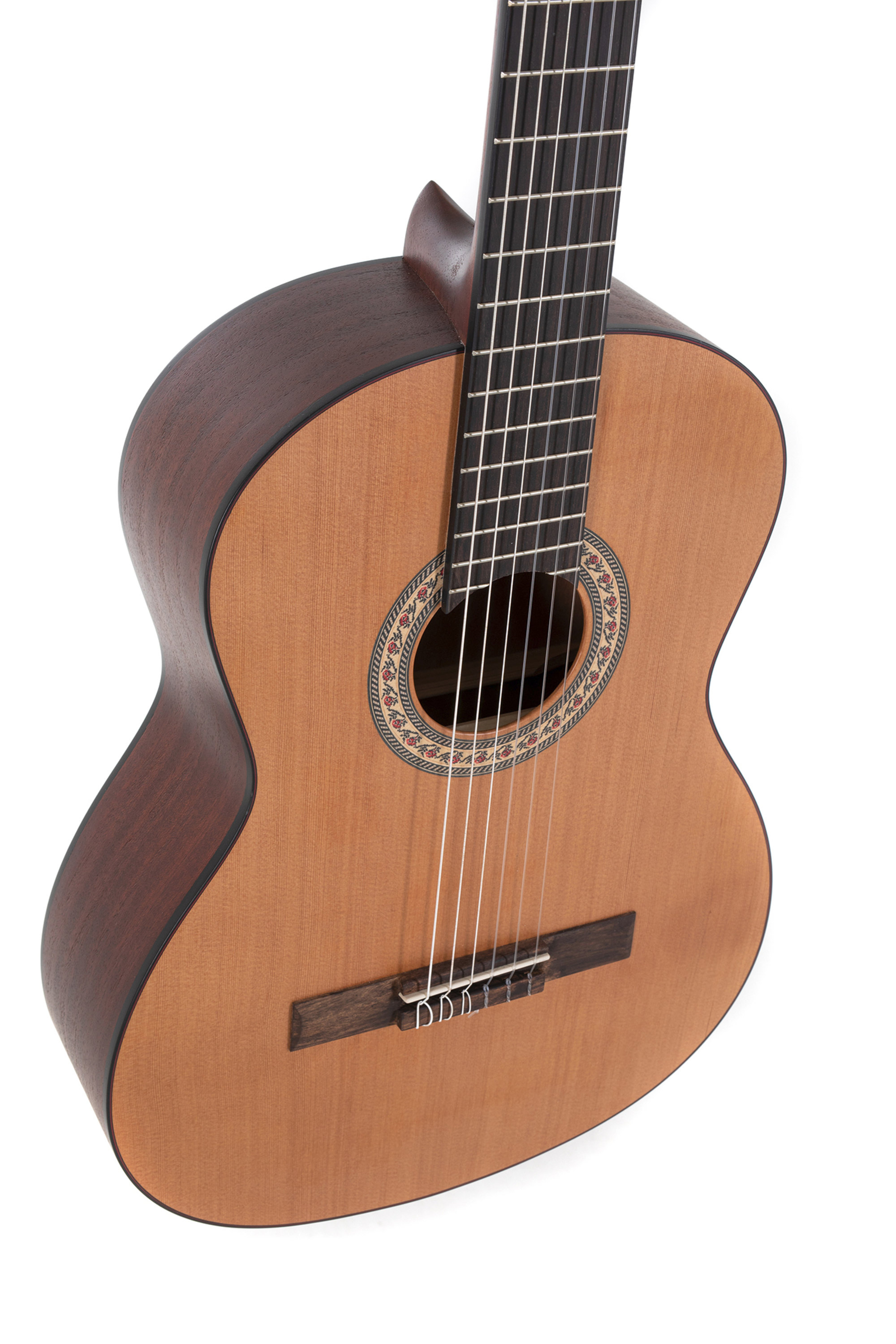 Eine wirklich schön gearbeitete Konzertgitarre mit massiver Zederndecke. Der Hals ist für die Stabilität mit Carboneinlagen verstärkt.